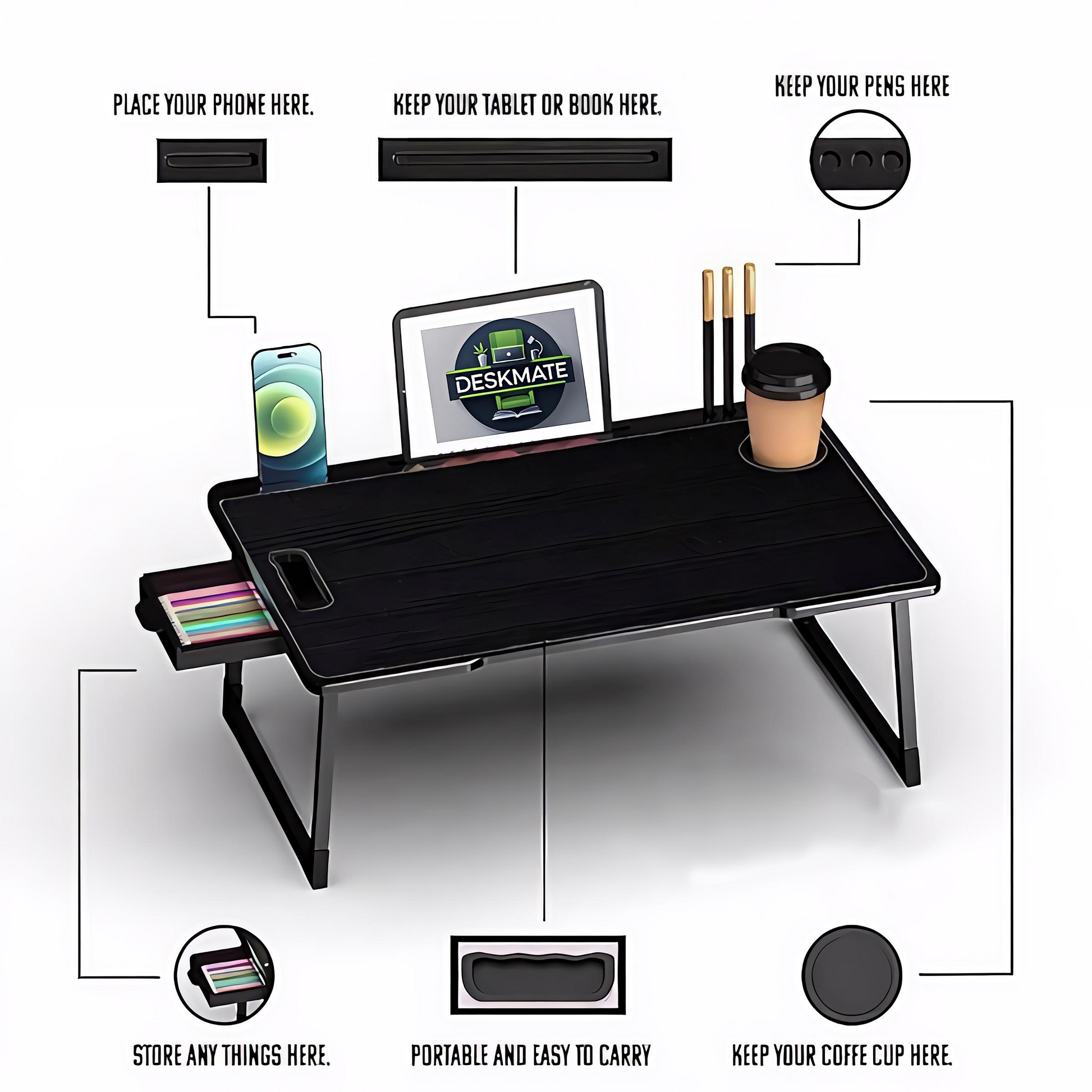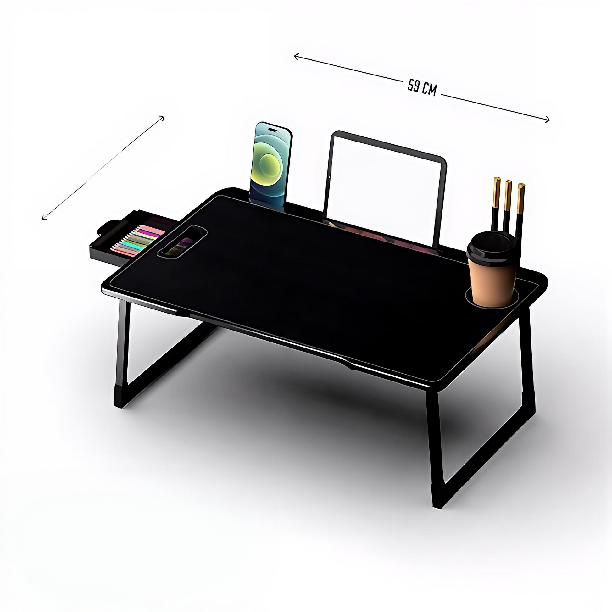 The table supports all standard laptops up to 17 inches along with tablets, books, and accessories.